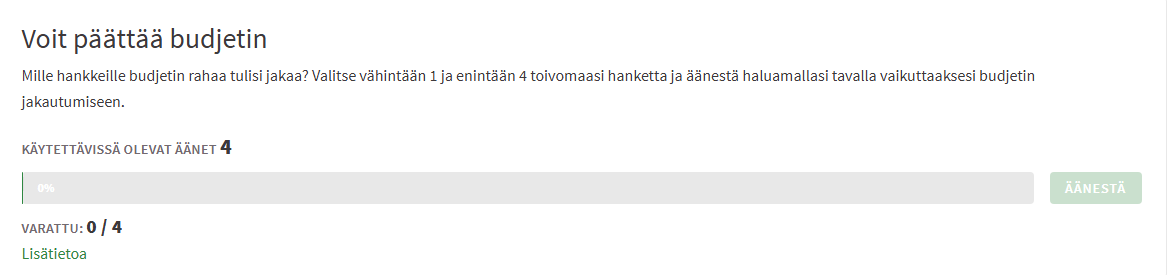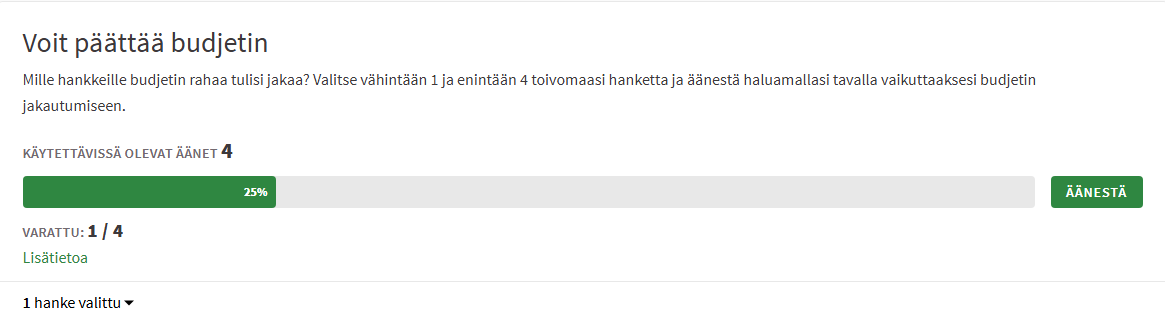 Voit tutustua äänestettäviin hankkeisiin äänestysnäkymän listasta ja valita niistä 1-4 suosikkiasi jolle annat äänesi. Valitse hankkeita joille haluat antaa äänesi painamalla listausnäkymässä niiden vieressä näkyvää valintakuvaketta.