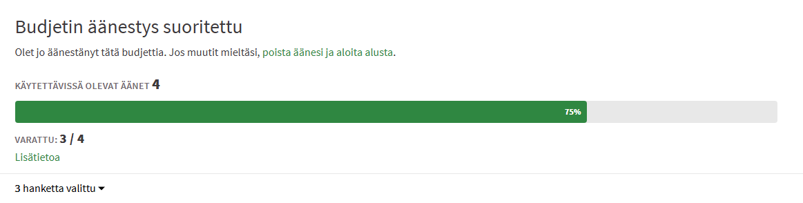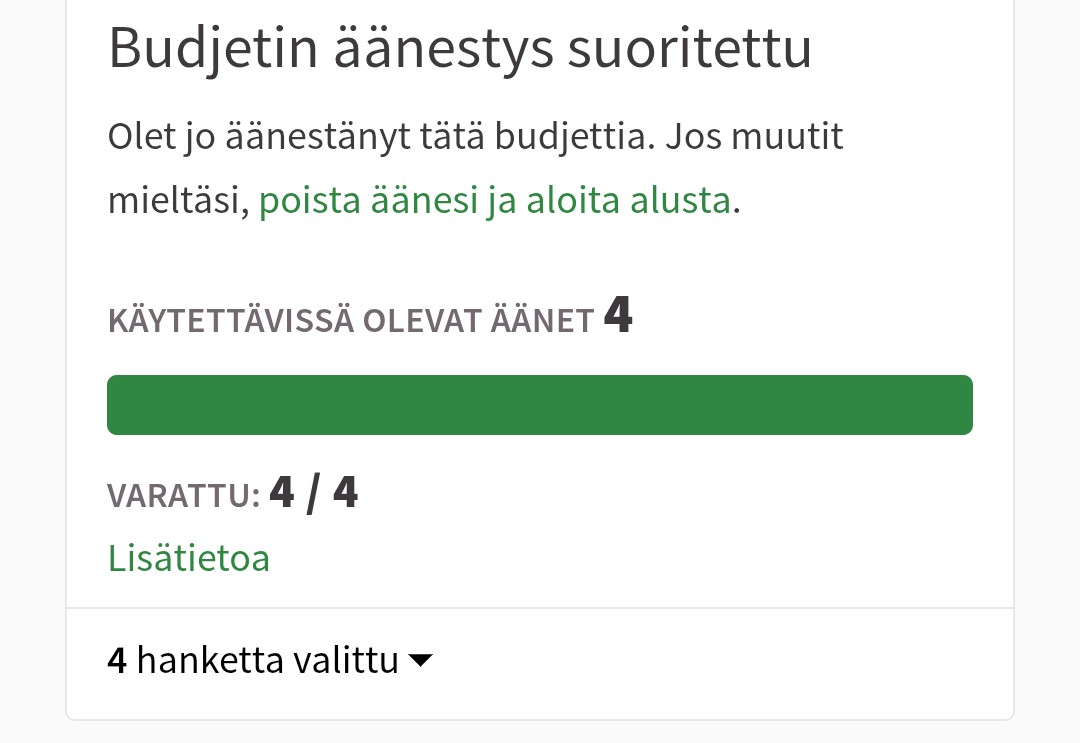 Tarkasta vielä, että valitsit oikeat hankkeet ja vahvista äänesi avautuvasta ikkunasta. Huomioithan, että esimerkkikuvan hankkeet ovat viime vuoden osallistuvan budjetin toteutukselta.