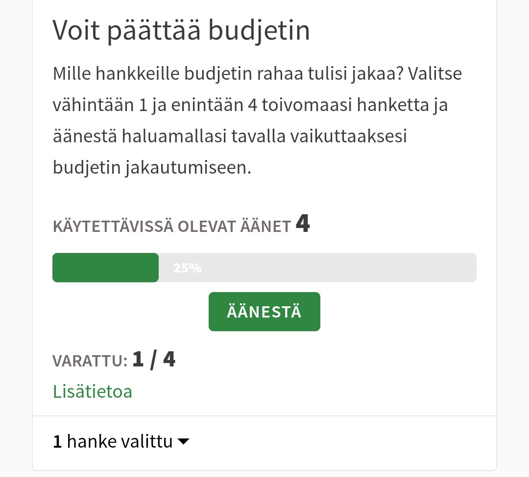 Mobiililaitteilla valintapainike näkyy puolestaan seuraavasti: Huomioithan, että esimerkkikuvan hankkeet ovat viime vuoden osallistuvan budjetin toteutukselta.